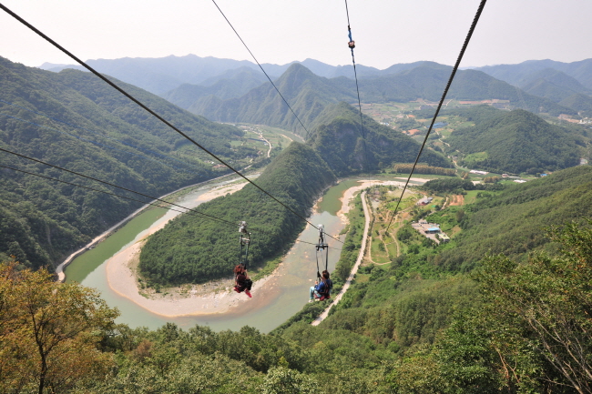 병방치 스카이워크와 광하리 생태체험학습장을 연결하는 짚와이어는 계곡과 계곡 사이를 쇠줄로 연결한